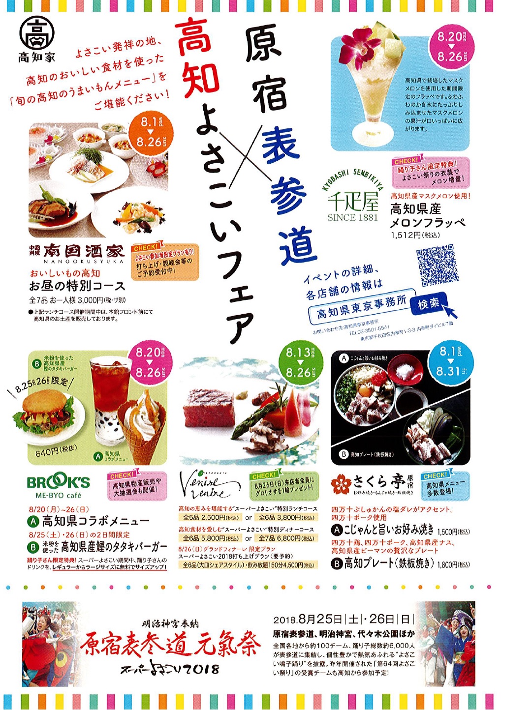 いよいよ今週末8月25日(土)、26日(日)に開催される「原宿表参道元氣祭スーパーよさこい」が開催されます!今年も全国各地から100チーム、踊り子総勢6,000人が表参道でよさこい鳴子踊りを披露。表参道がよさこい一色となり、熱気に溢れる2日間となるでしょう!!また、このイベントを前に、よさこい発祥の地・高知と原宿表参道エリアの飲食店がコラボし、期間限定で『原宿表参道×高知よさこいフェア』を開催中!今しか味わえない、高知の旬の食材を使ったコラボメニューを、ぜひ各店でお楽しみください!