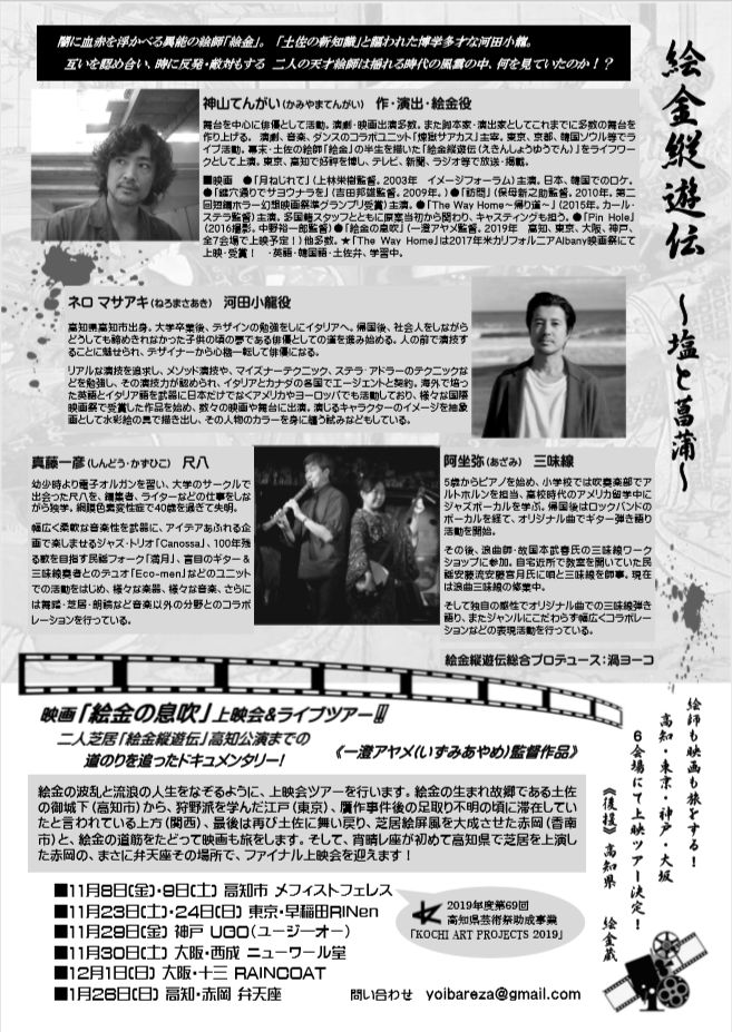 尚、11月からは、高知市・東京・大阪・神戸・高知県香南市にて、「絵金縦遊伝」高知公演までの道のりを追った、ドキュメンタリー映画の上映イベントを行います。高知ゆかりのアーティストや研究家の方をお招きして、たっぷりと絵金に浸るイベントです。