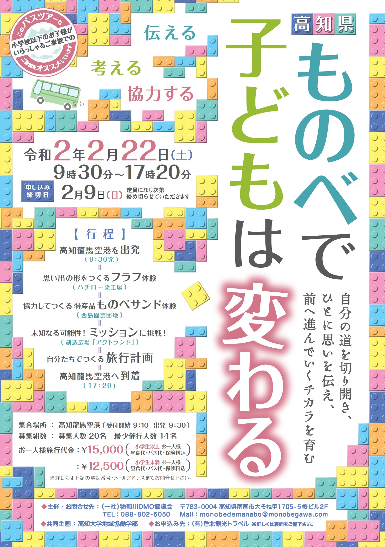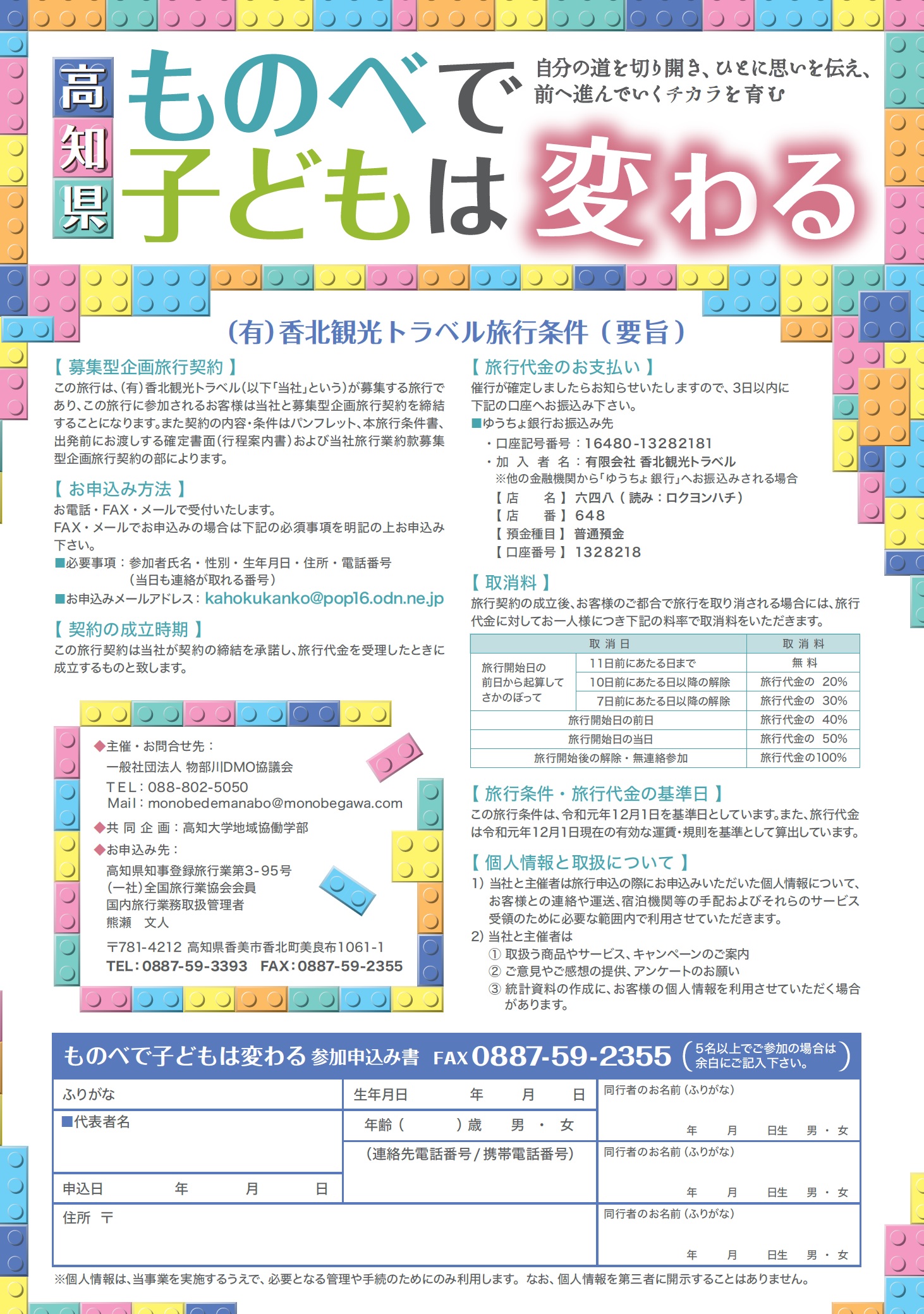 高知大学地域協働学部の学生とともに、大学生ならではの発想で、お子様が「自分の道を切り開き、ひとに思いを伝え、前に進んでいくチカラを育んでゆく」きっかけになれればと考えるプランを、ものべがわエリアの観光施設と協力して作りました。