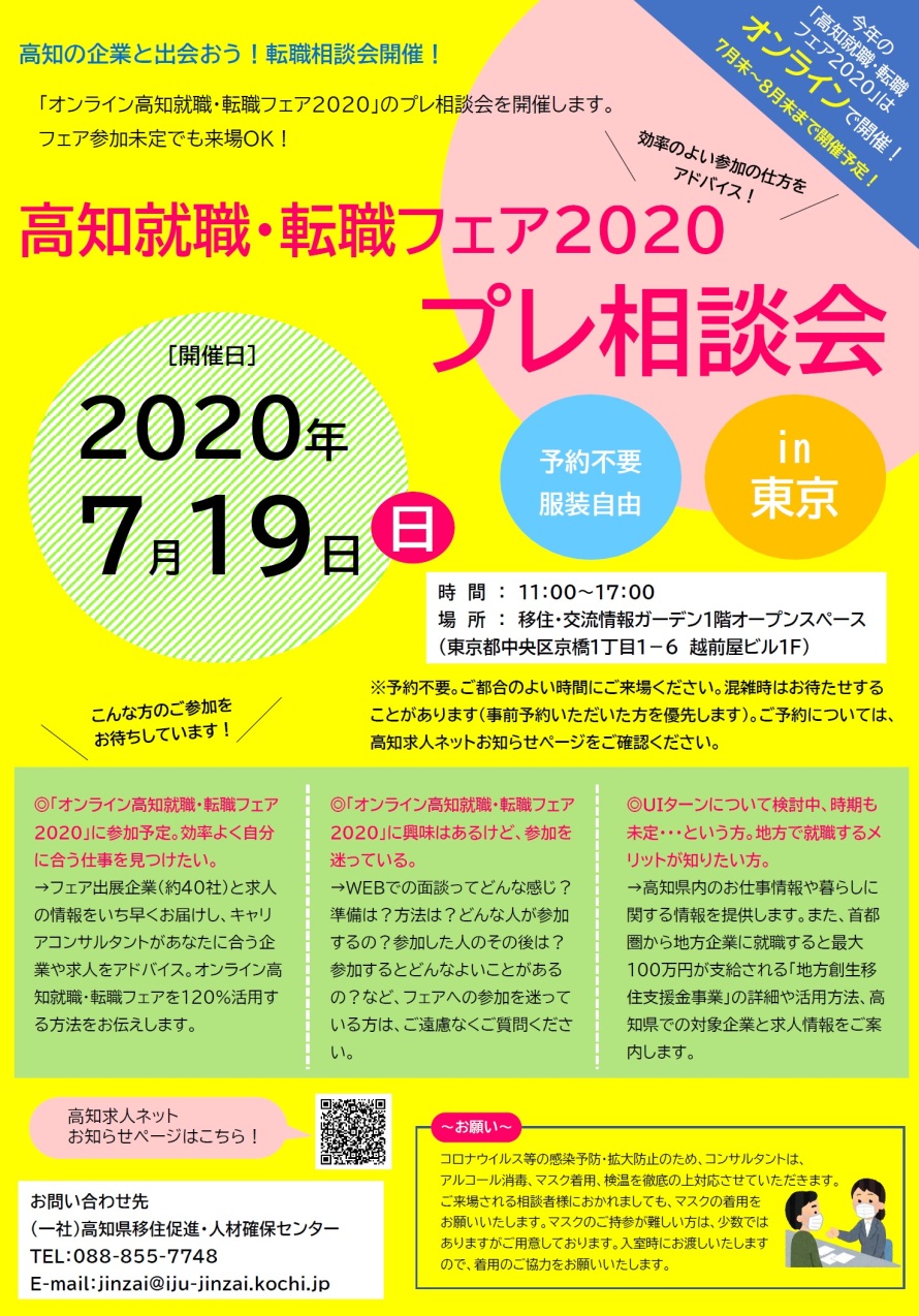 7月19日開催をご案内しておりましたプレ相談会は、新型コロナウィルス感染拡大の影響を鑑み、オンライン開催に変更しました。オンライン接続可能であればご自宅からでも参加できます。また、当日、会場にご来場いただきましたら、会場設置のPCを通して高知のキャリアコンサルタントとのオンライン面談が可能です。
