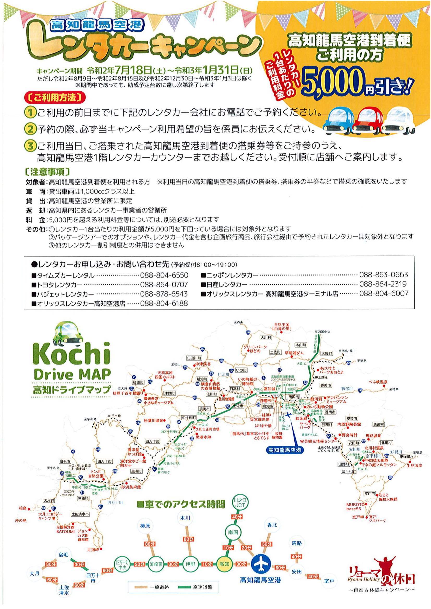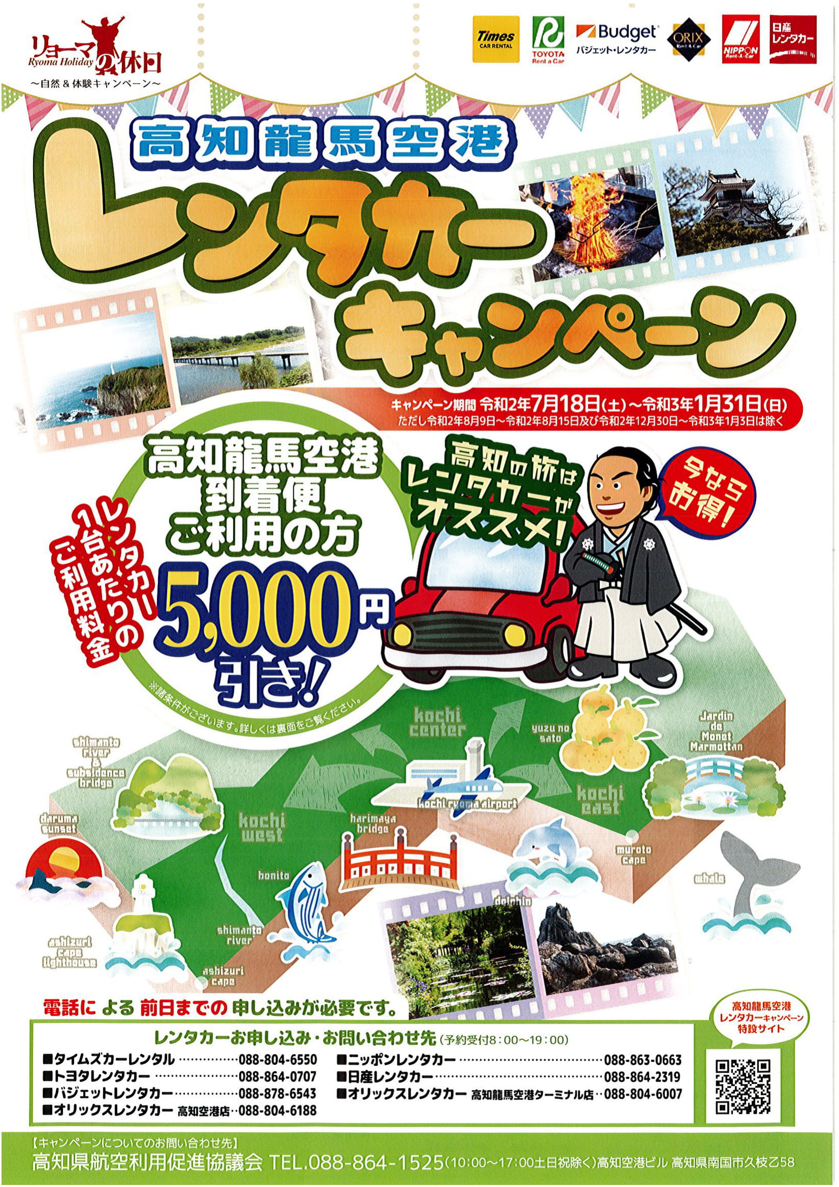 高知龍馬空港到着便でレンタカーをご利用の方は1台当たり5000円引きのの割引キャンペーンを行っています。