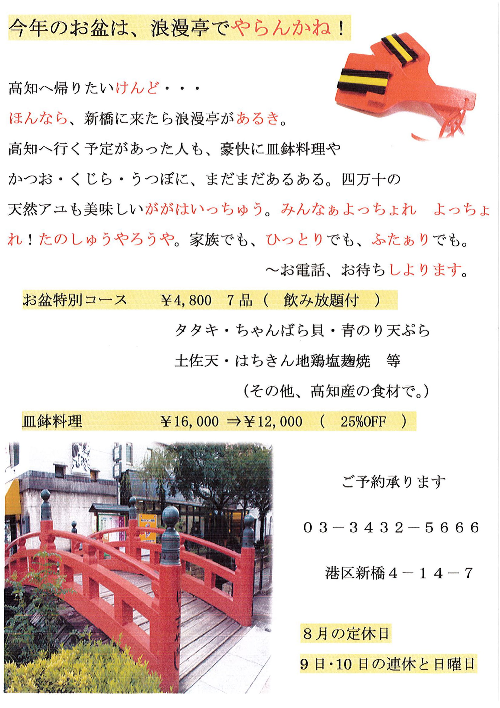 と、そんなふるさと高知への想いが募る方、ぜひ新橋浪漫亭へ!!