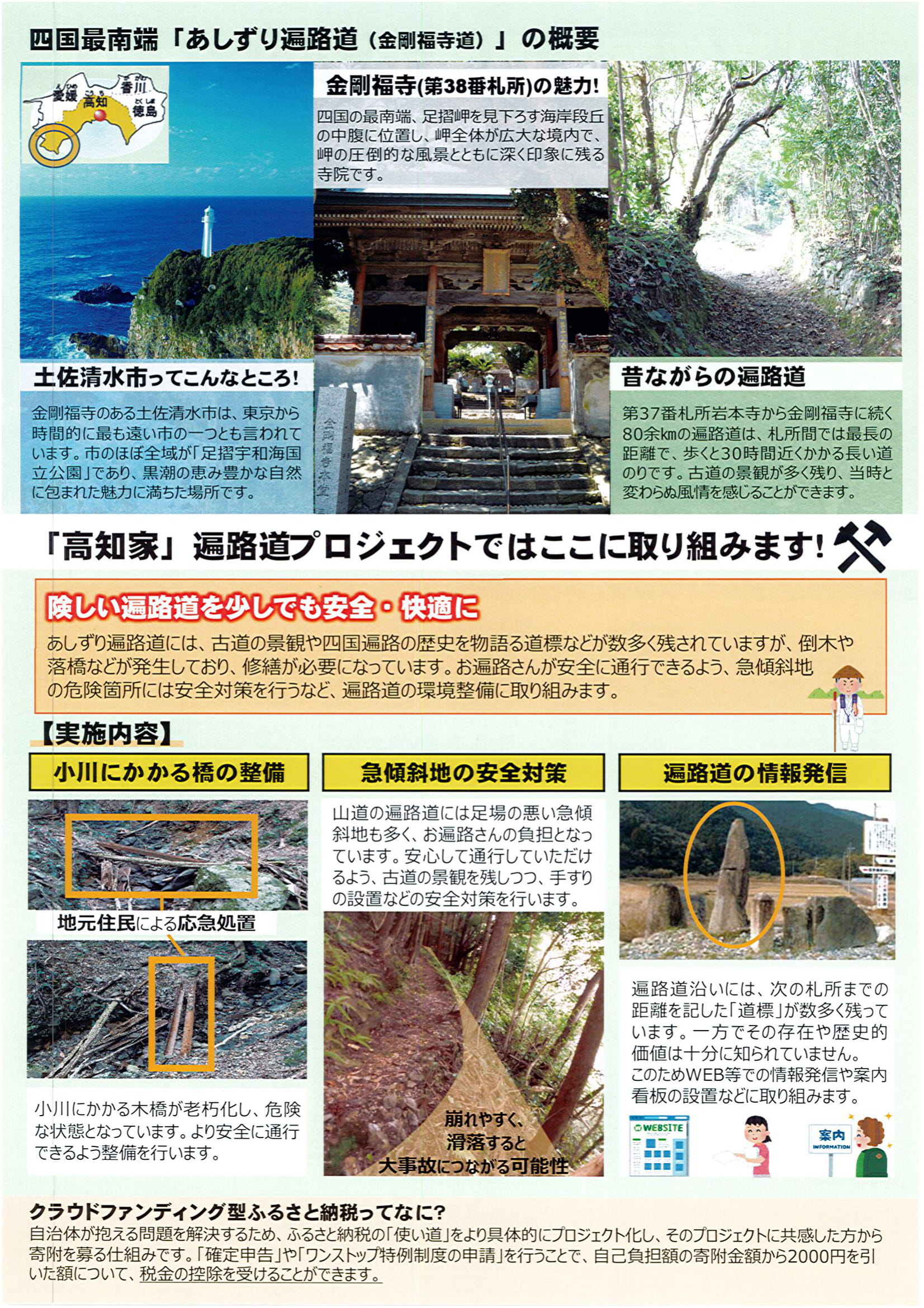 四国遍路は、弘法大師ゆかりの四国88か所の霊場を巡る約1200年もの歴史をもった祈りの道でしたが、近年お遍路さんが減少しており、遍路文化の継承が課題となっています。今後もこの伝統を守るため、遍路道の保全や環境整備のため、ぜひご協力をお願いします。