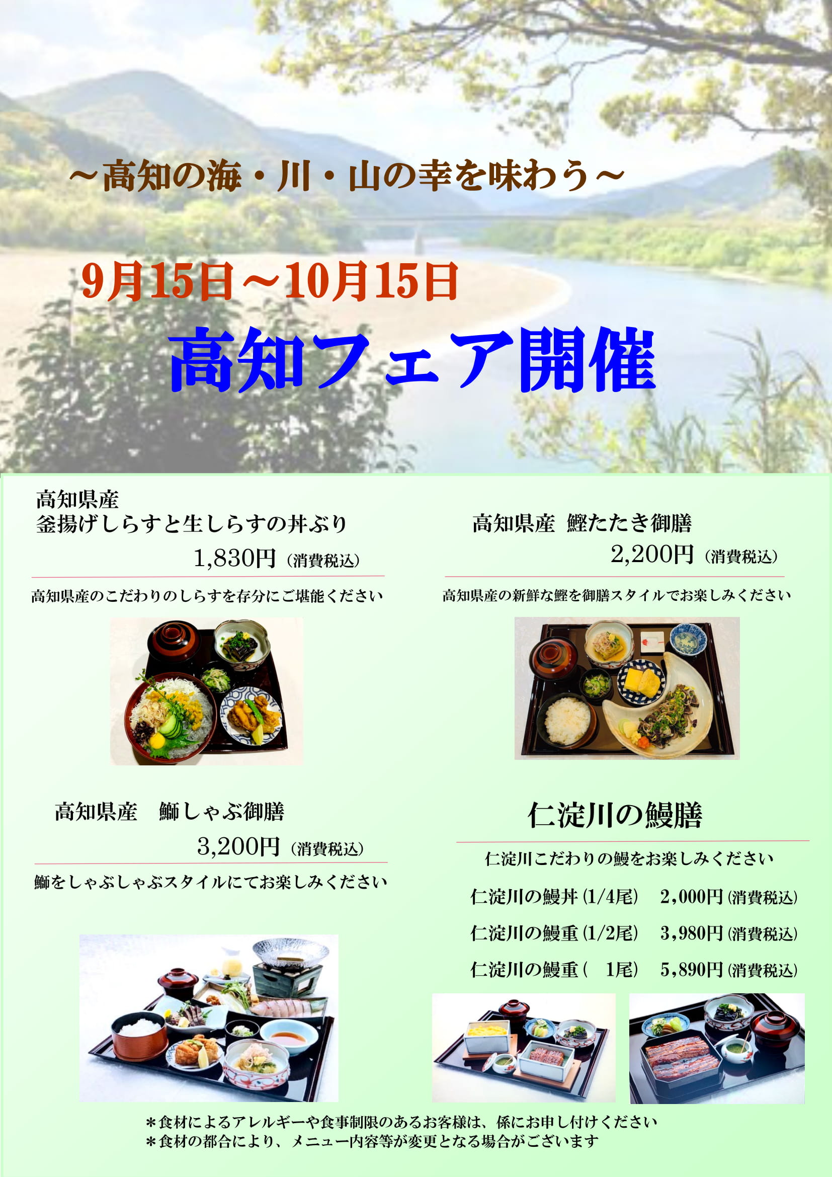 鰹だけではなく、仁淀川の鰻や鰤しゃぶ御膳、しらす丼など高知の味覚があじわえます。