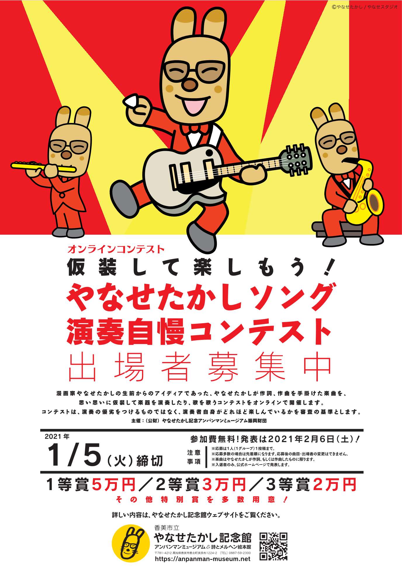 漫画家やなせたかしさんが作詞、作曲を手掛けた楽曲を、仮装をして、歌を歌う、楽器を演奏するコンテストをオンラインで開催します。演奏の優劣ではなく、どれだけ楽しんでいるかが審査のポイント!