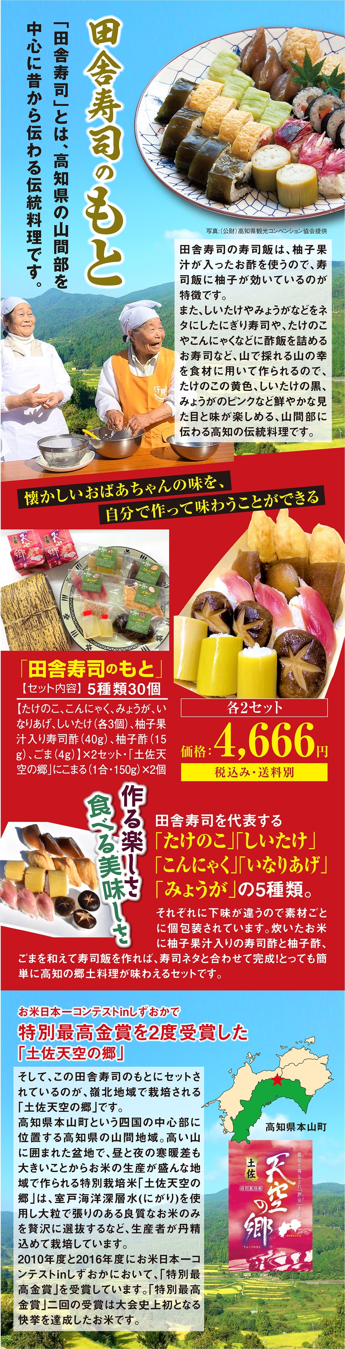今回ご紹介する「田舎寿司のもと」は、下味がついた寿司ネタと寿司酢や柚子酢、土佐天空の郷がセットされており、炊いたお米に寿司酢などを混ぜ合わせ、寿司ネタに合わせると懐かしい田舎寿司が味わえるセットです。