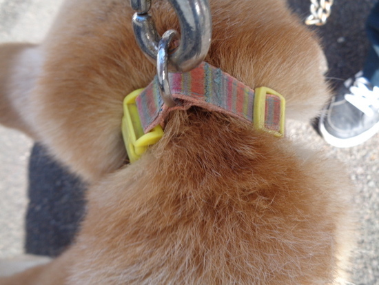 雑種 メス 赤青のストライプの首輪、黄色の留め具