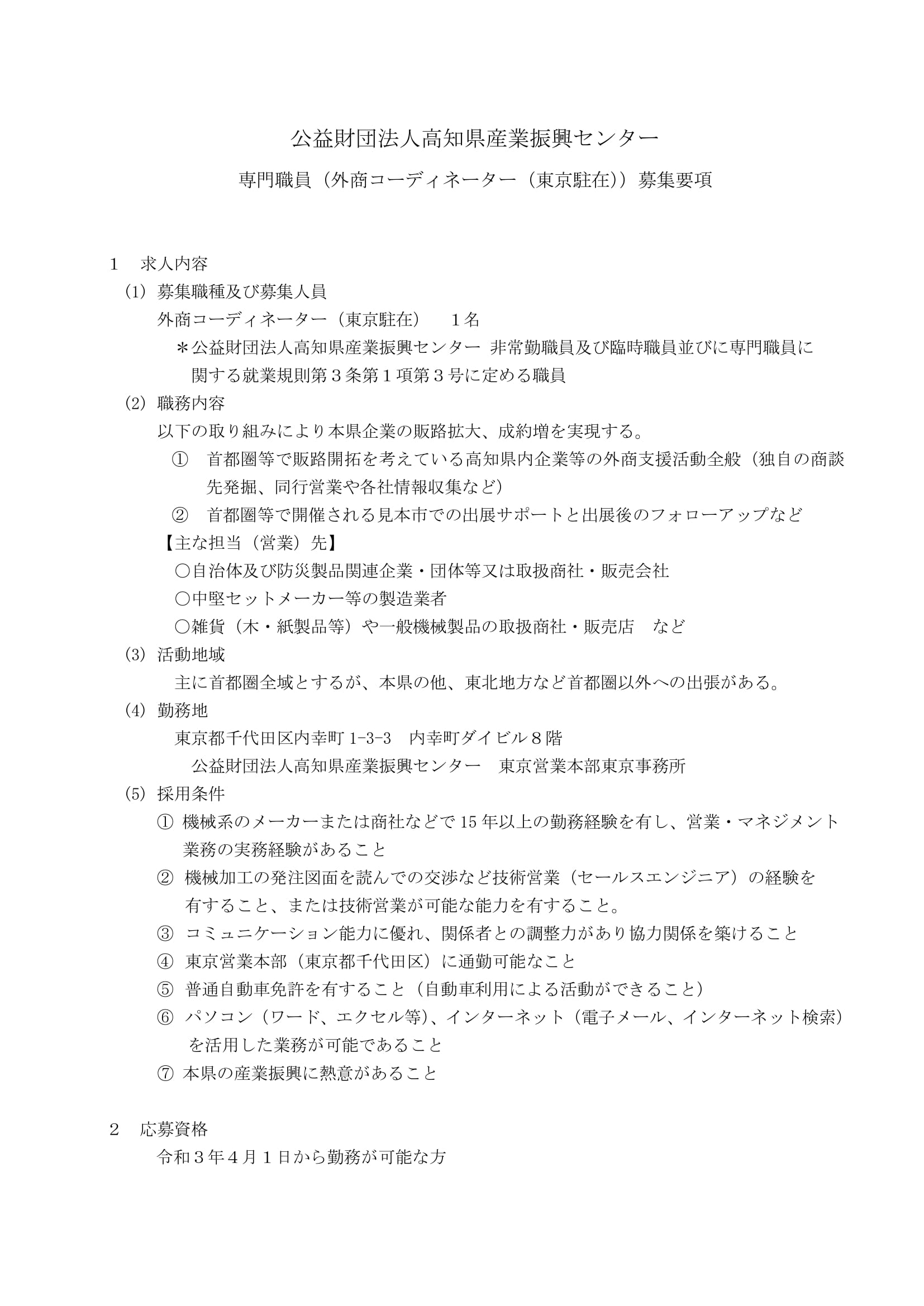 高知県産業振興センターでは、外商コーディネーター(東京駐在)を募集しております。