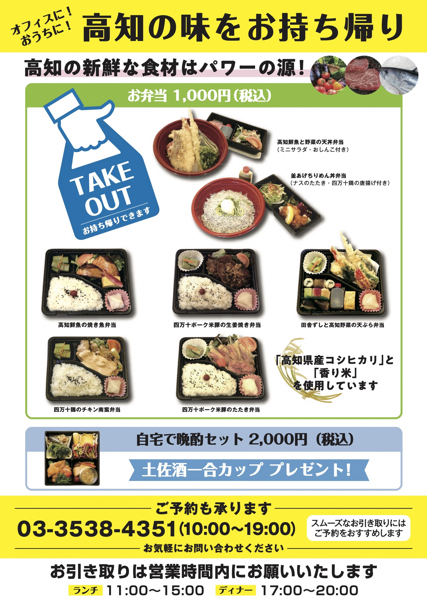 今回は、まるごと高知2階おきゃくのテイクアウトお弁当のご紹介です。コロナ禍の今、テイクアウトできるのは嬉しいですね。私は「釜揚ちりめん丼弁当」と「田舎ずしと高知野菜の天ぷら弁当」「自宅で晩酌セット」をいただきましたが、どれも満足感たっぷりのいいお味でしたよ。ぜひお試しいただきたいです。