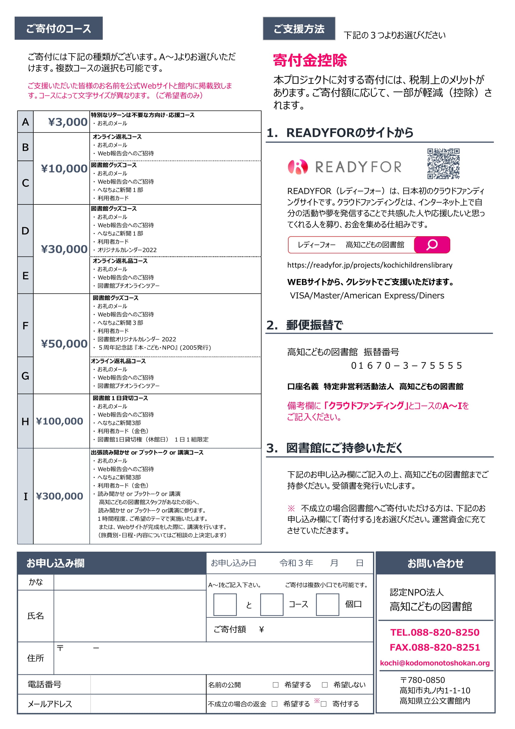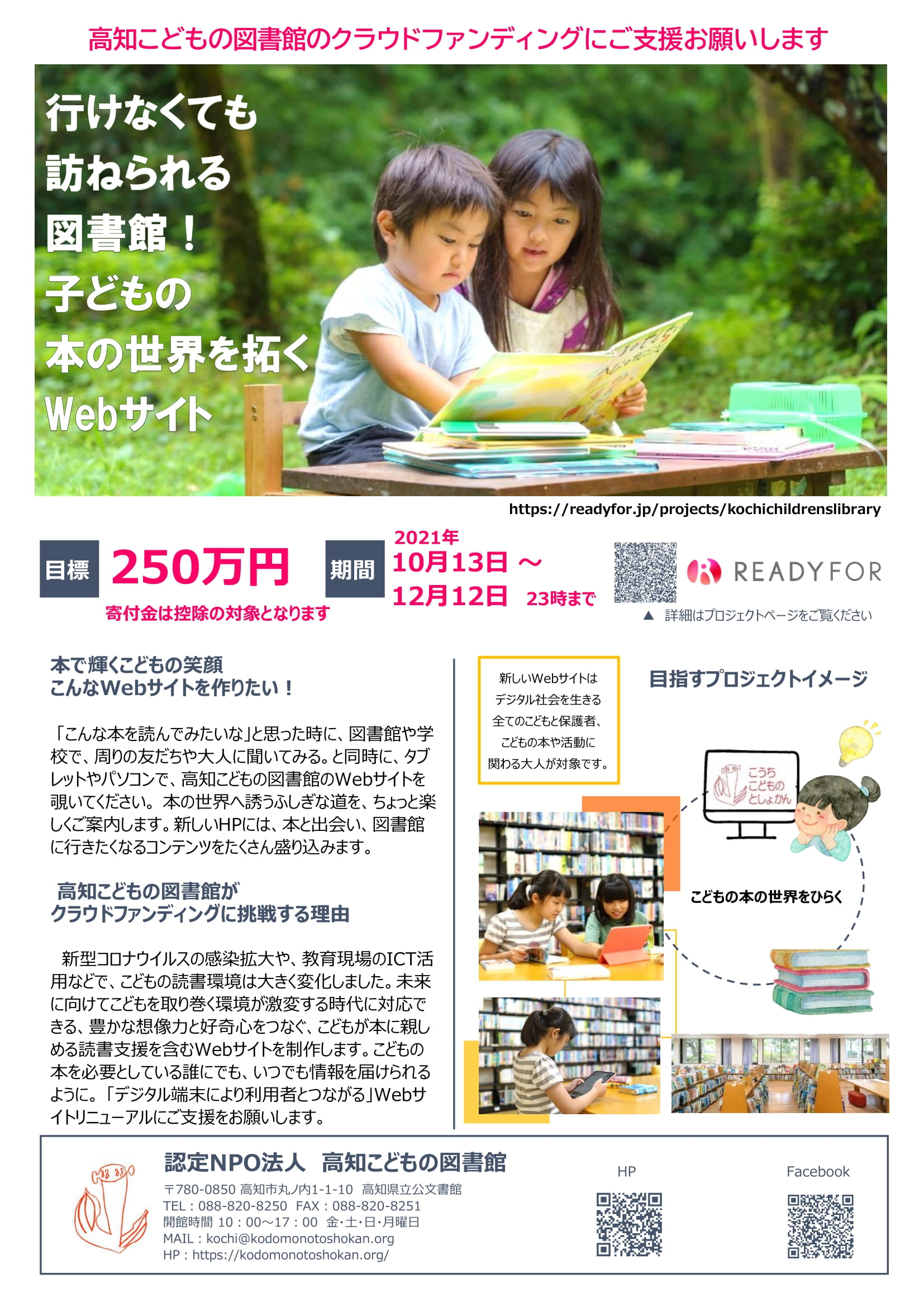 ウェブサイト制作にかかる資金250万円を、READYFORというプラットフォームで調達します。新しいウェブサイトには、子どもたちが本と出会い、地域の図書館に行きたくなるようなコンテンツを盛り込みます。