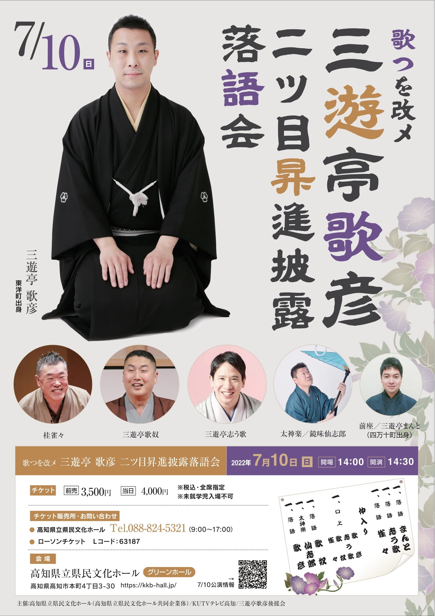 昨年のオンライン大懇親会にてご出演いただいた落語家 三遊亭歌彦さん(東洋町出身)の二ツ目昇進落語会が高知県立文化センターにて開催されます。少し先になりますが、ぜひお誘いあわせの上、足をお運びください。