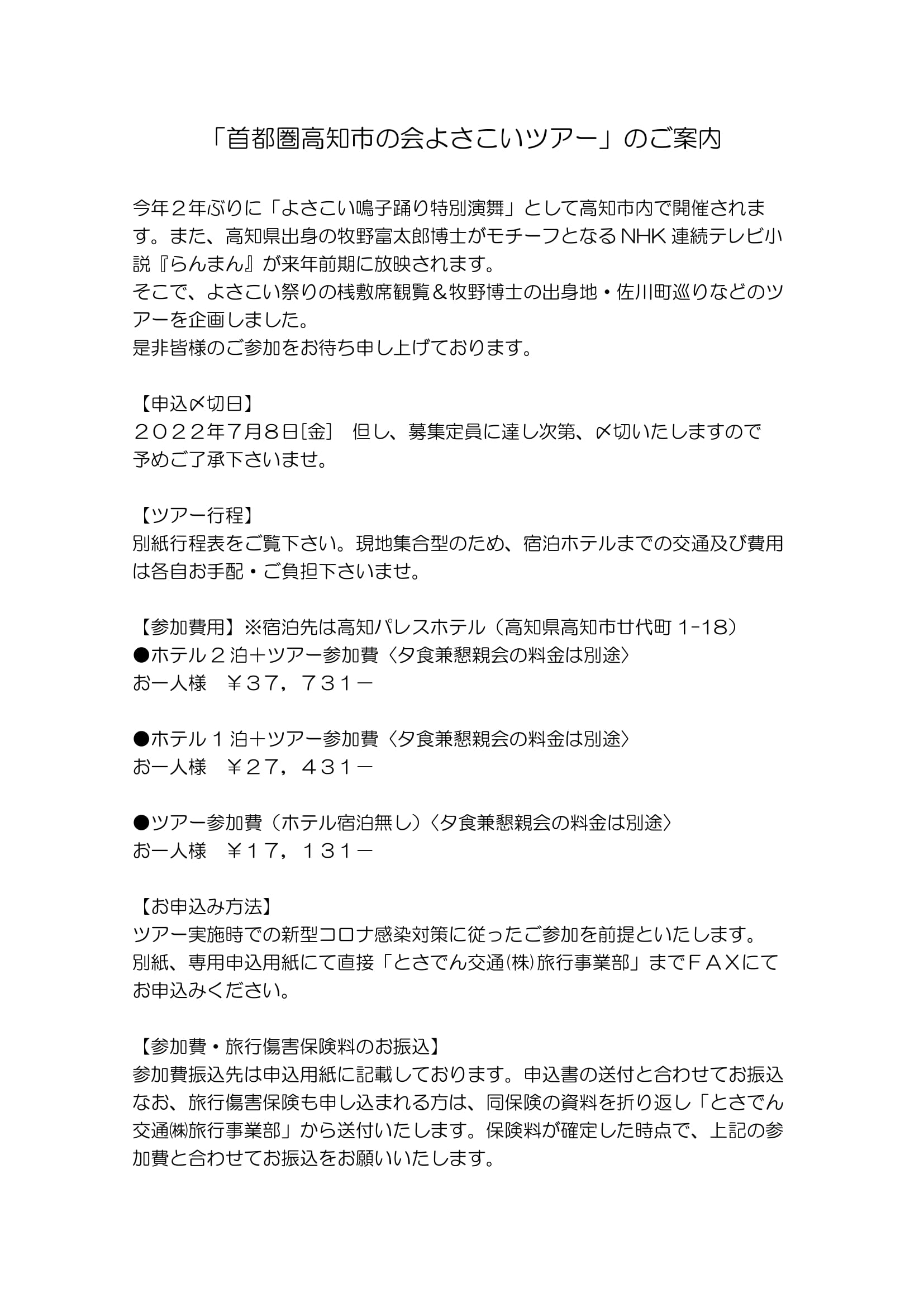 首都圏高知市の会主催の「よさこいツアー」参加者募集のお知らせです。