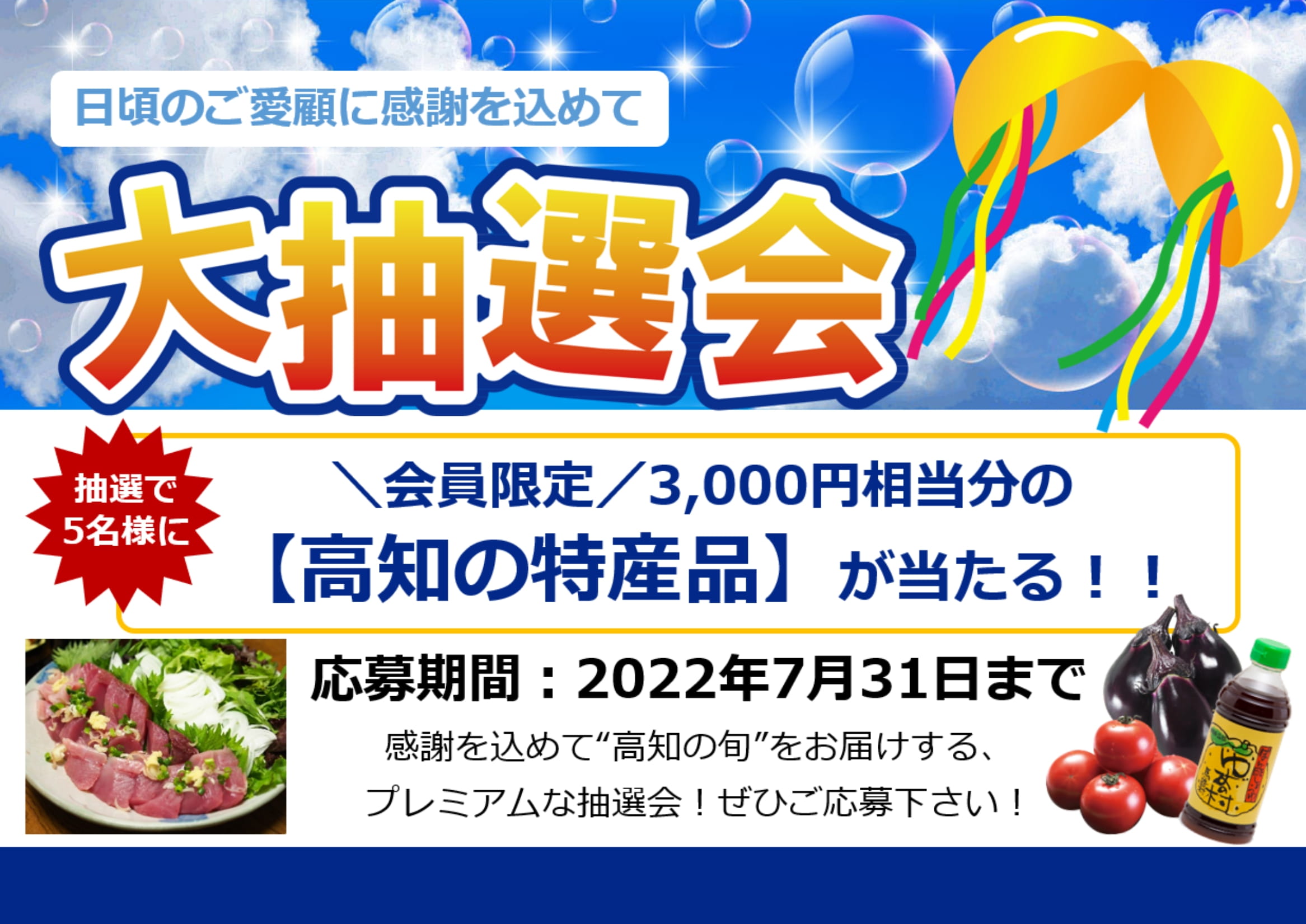 申込み賞品: 3,000円相当分の「高知の特産品」プレゼント(抽選で5名様)