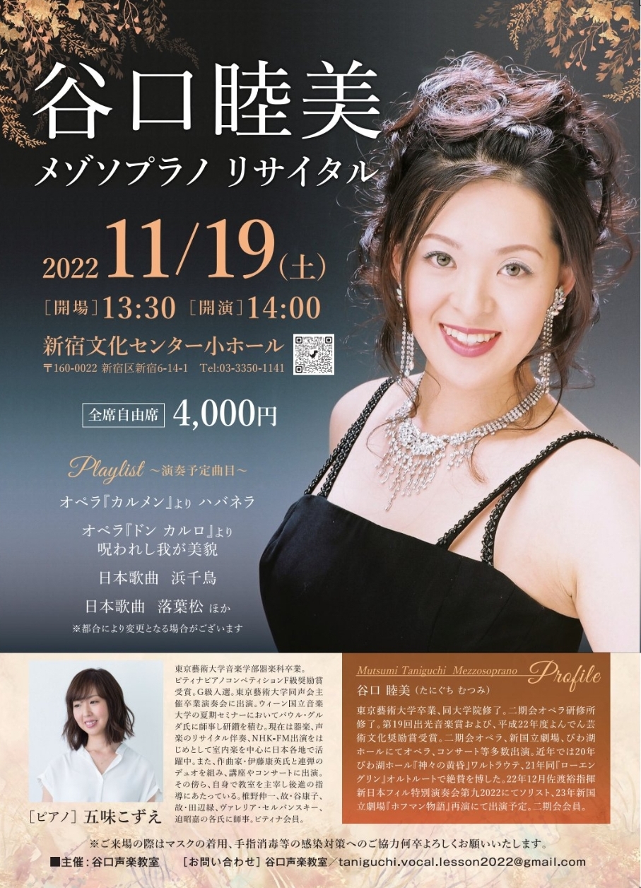 県人会会員でもありメゾソプラノ歌手谷口睦美さん(室戸市出身)のリサイタルのお知らせが届きました。コロナ禍でなかなか開催が厳しかったコンサートもようやく戻りつつあります。後援、スポンサーもなく谷口睦美さんの個人主催のリサイタルとのこと。