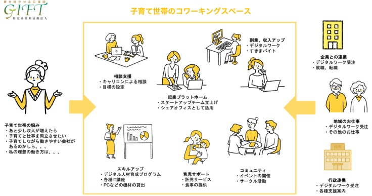 NPO法人「GIFT」は、子ども食堂の運営やひとり親家庭の支援を通じ、不登校の子どものための居場所づくりや、子育て世帯の包括的な支援を中心に精力的に活動しています。現在GIFTでは、子育て世帯のIT技術の習得や、子どもを預けて業務が出来るコワーキングスペースの運営資金をクラウドファンディングで募集しています。