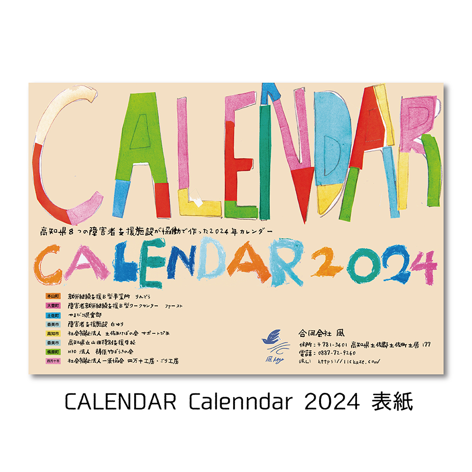 今回で4年目の取り組みとなる2024年のカレンダー。今回は高知県内8つの障がい者支援施設と支援学校の利用者さん、児童が描いた数字と文字で作ったカレンダーです。