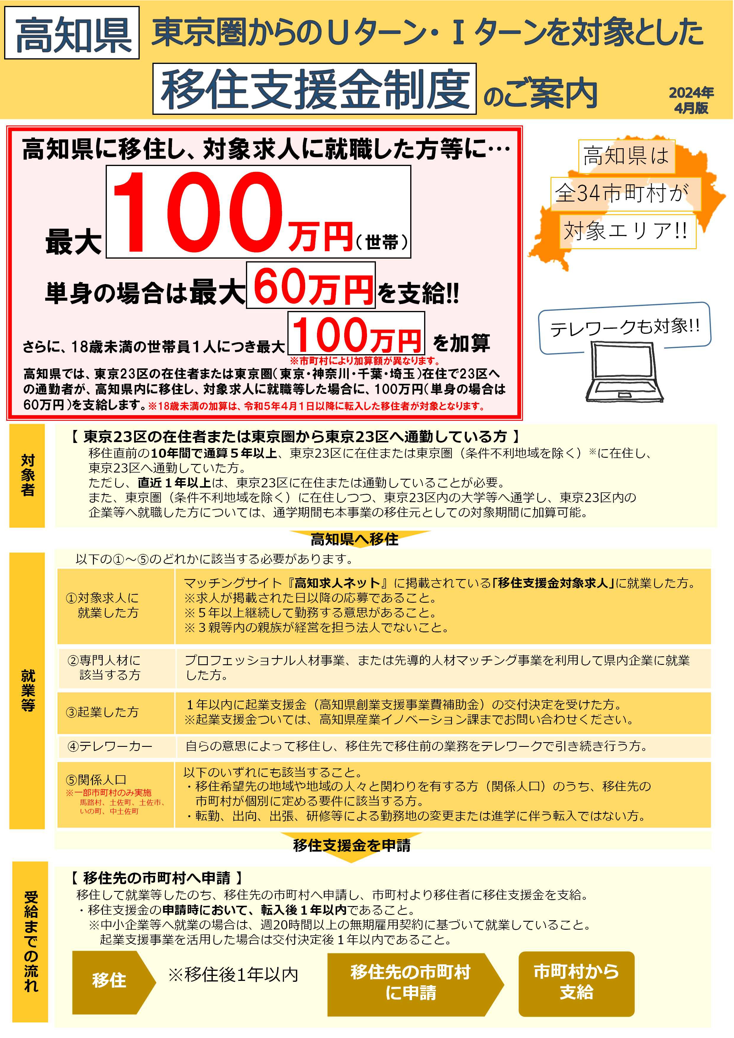 東京23区の在住者または東京圏から東京23区に通勤している方が、高知県内に移住し、対象求人に就等した場合、最大で100万円が移住支援金として支給されるそうです。