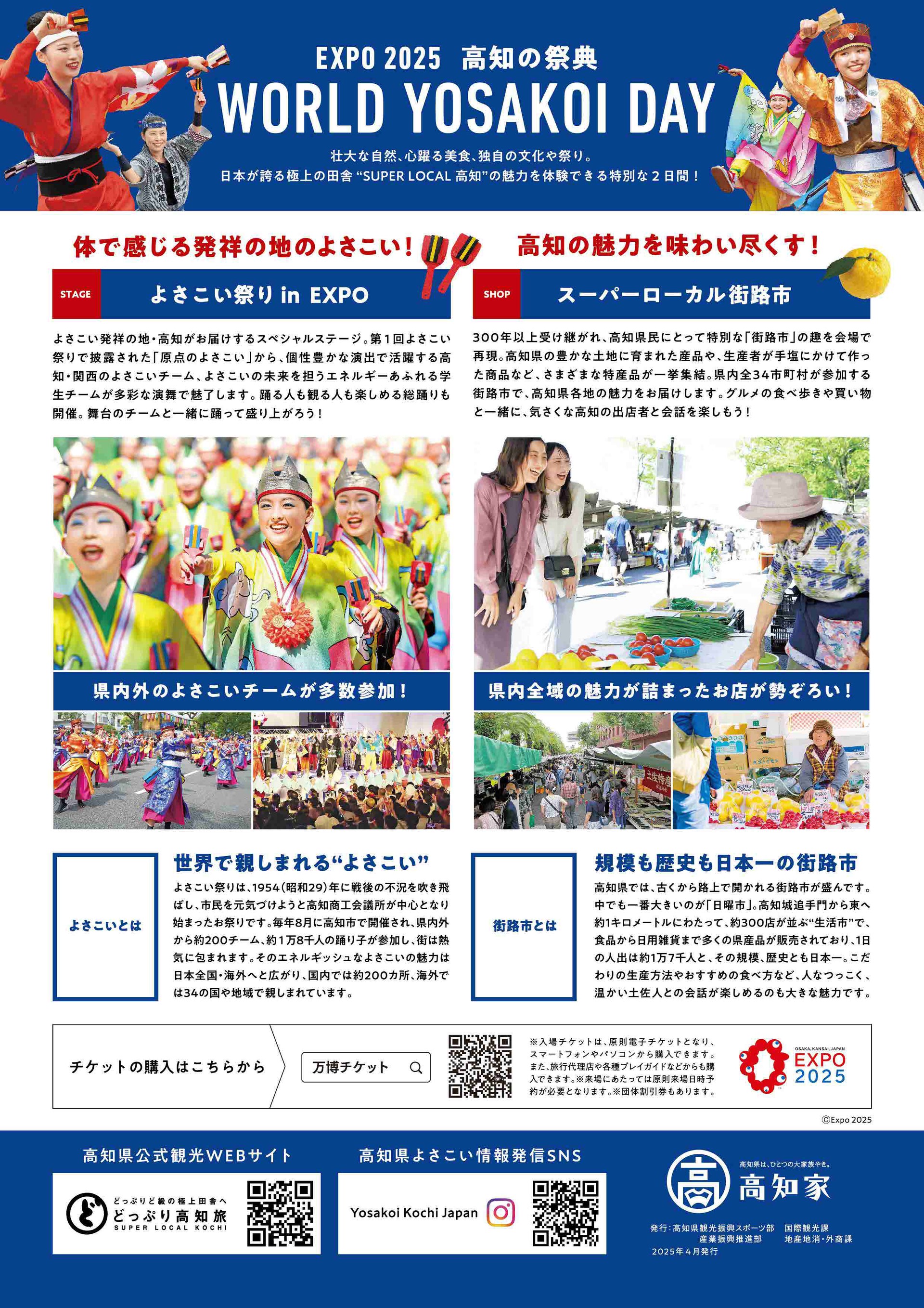 内 容:高知発祥の「よさこい鳴子踊り」と300年以上の歴史を誇る「街路市」を柱とした、高知の文化や食などの魅力を体感いただくイベントを開催