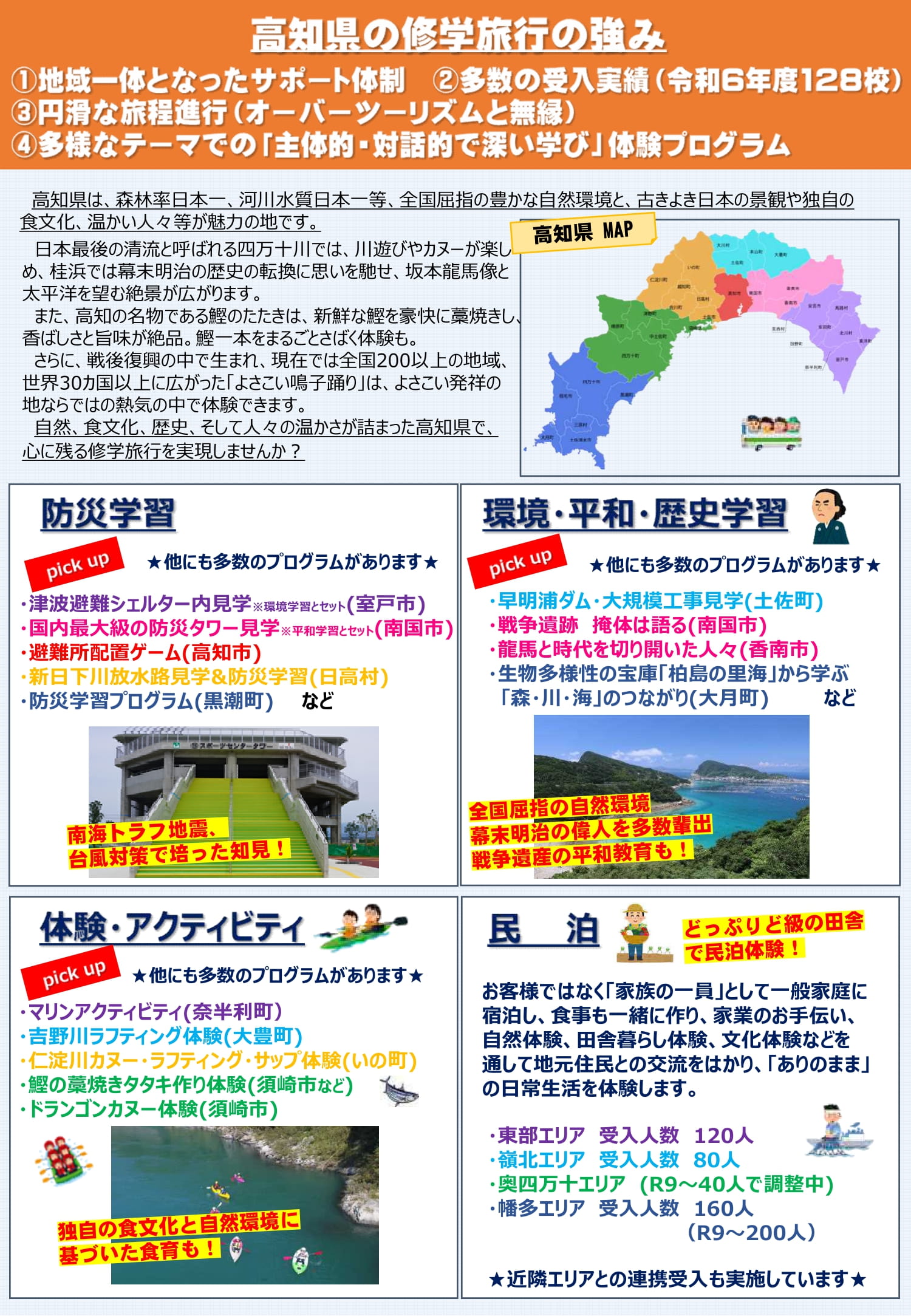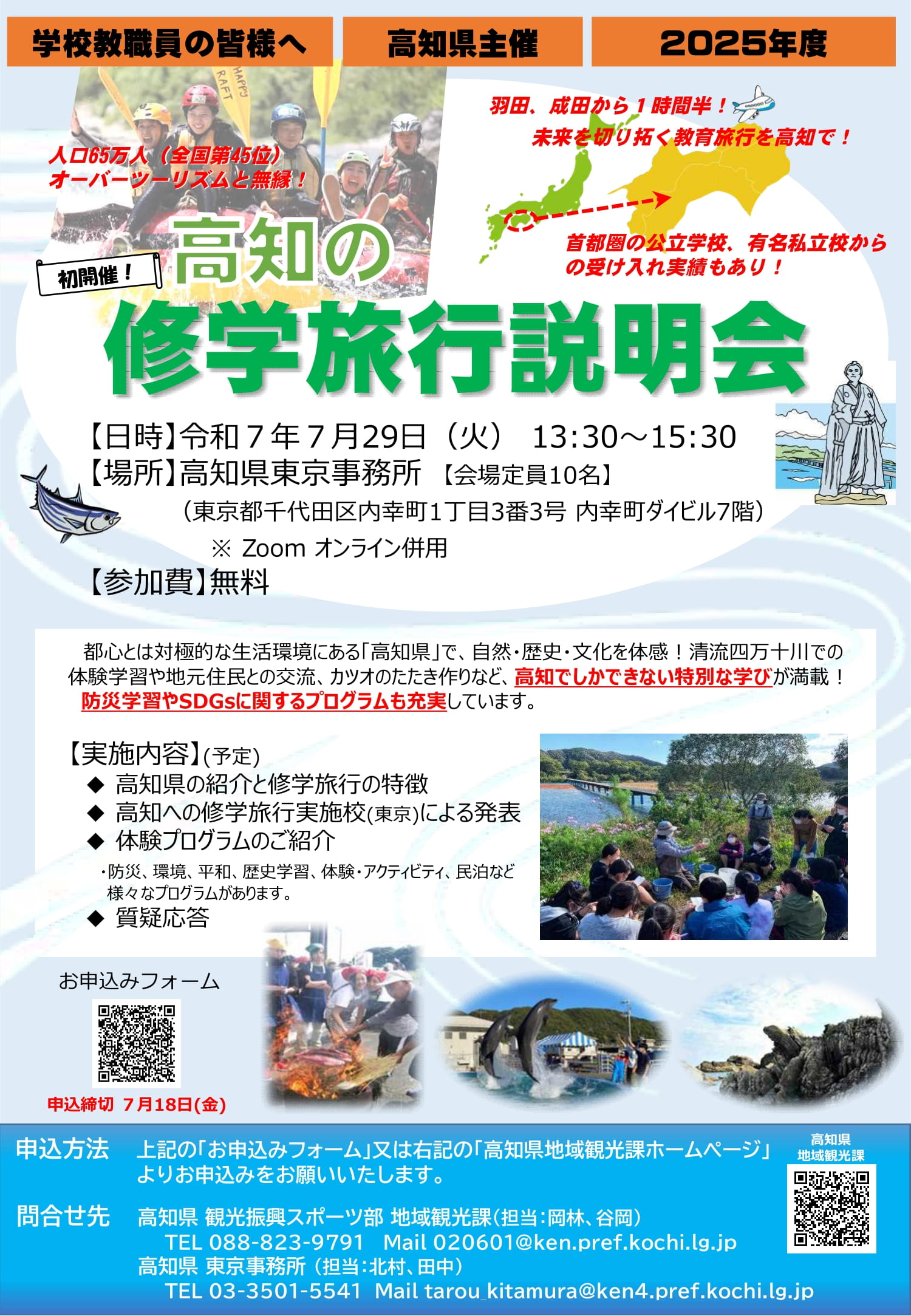 さて、このたび首都圏の学校向けに「高知の修学旅行説明会」を開催することとなりました。 首都圏からは対極の環境にある高知の豊かな自然や食、幕末明治の歴史、よさこい文化、防災取組などを用いて、高知だからこそできるよりよい修学旅行をご提案します。 お知り合いの学校関係の皆様にぜひお声がけいただきますようお願いいたします。 なお、お申込みにつきましては、チラシのQRコードまたは次のURLからも行えます。 https://www.pref.kochi.lg.jp/form/020601/kochi_setumeikaimousikomi_form/ ―高知の修学旅行説明会概要― 日時:令和7年7月29日(火) 13:30―15:30 場所:高知県東京事務所 【会場定員10名】 (東京都千代田区内幸町1丁目3番3号 内幸町ダイビル7階) ※ Zoom オンラインでのご参加も可能です。 参加費 無料 【実施内容】(予定) ◆ 高知県の紹介と修学旅行の特徴 ◆ 高知への修学旅行実施校(東京)による発表 ◆ 体験プログラムのご紹介 ・防災、環境、平和、歴史学習、体験・アクティビティ、民泊など様々なプログラムがあります。 問合せ先 高知県東京事務所(担当:北村、田中) TEL 03-3501-5541 E-mail tarou_kitamura@ken4.pref.kochi.lg.jp