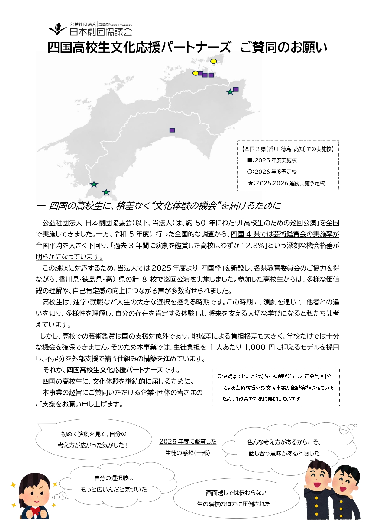 高校での芸術鑑賞は現状、国の支援対象外であり、生徒数や地理的条件による負担格差も大きく、学校だけでは十分な機会を確保できません。そのため本事業では、生徒負担を1人あたり1,000円に抑えるモデルを採用し、不足分を外部支援で補うことで持続可能なものとする「四国モデル」の構築を目指しています。